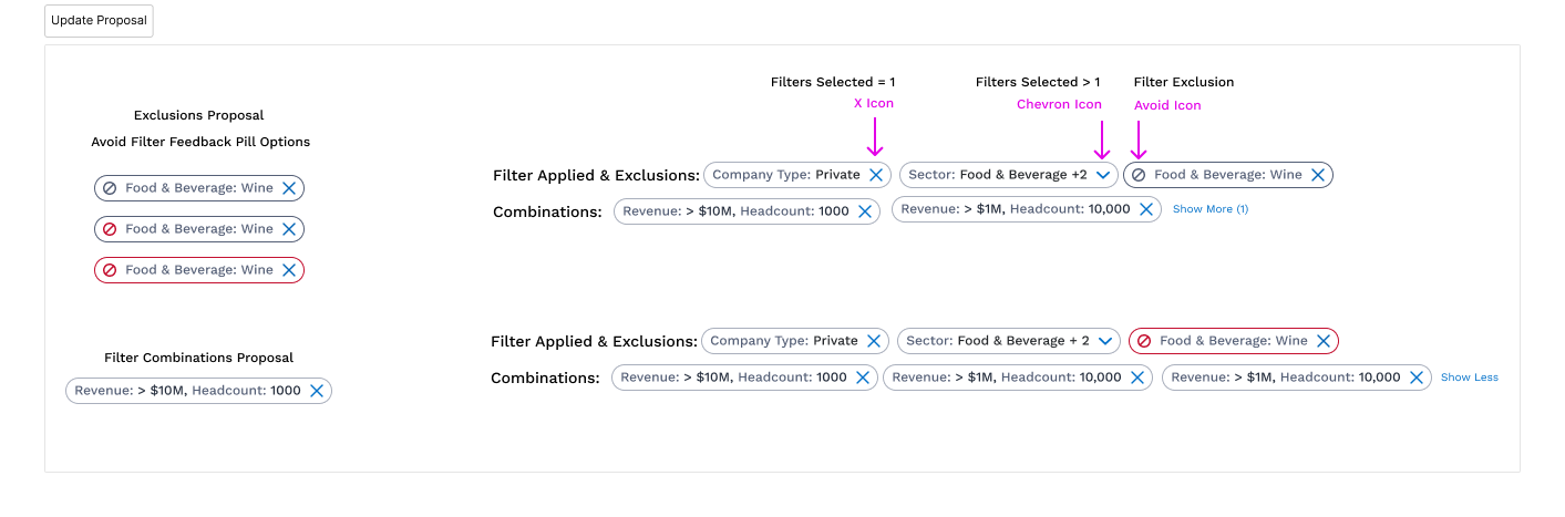In this Ai Chat project at Factset, I proposed an update to the library Filter Feedback Pills component. The proposal first suggesting using filter feedback pills above the Screening results to help the user track changes made from their natural language input in the chat tool. I also proposed a visual update using design changes and new icons for Filter Exclusions and Filter Combinations.